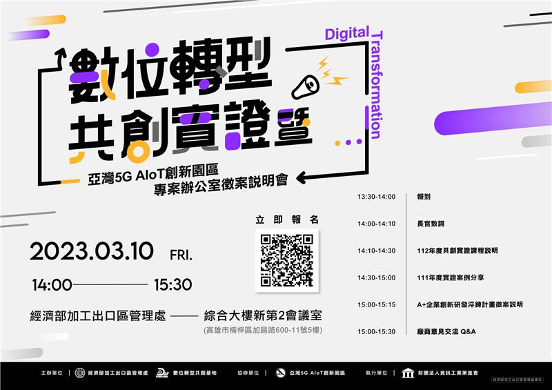 第三屆科技產業園區「數位轉型共創實證課程」招生啟動,邀請有意數位轉型的製造業、資服業者,把握限量名額參加112年度實證課程。經濟部加工出口區管理處(以下簡稱加工處)將於3月10日線上線下同步舉行112年度招生說明會,並邀請亞灣5G AIoT創新園區專案辦公室,進行A+企業創新研發淬鍊計畫說明,歡迎企業踴躍參加。(詳情https://reurl.cc/YdzE1L)